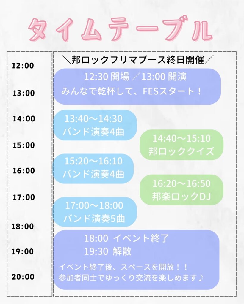 LoveROCKで出会ったメンバーでコピーバンドライブを行います。楽器未経験や初心者の方が1年間練習した成果を披露しますので、是非見に来てほしいです。また、ライブの間や会場内でクイズ企画やフリマブースなど、退屈な時間や1人の時間が出来ないような企画やブースを計画中です。1人で来ても、その場はもちろん、帰り道や明日からのライブも一緒に楽しむことができる最高の邦ロック好き仲間に出会えるフェスにしたいと思います!